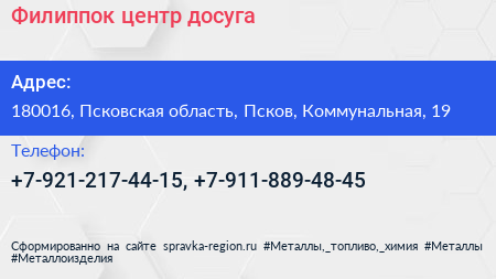 Филиппок, центр досуга по адресу 180016, Псковская область, Псков, Коммунальная, 19 в дальнейшем Организация, размещена в следующих категориях: