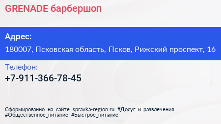 GRENADE, барбершоп по адресу 180007, Псковская область, Псков, Рижский проспект, 16 в дальнейшем Организация, размещена в следующих категориях: