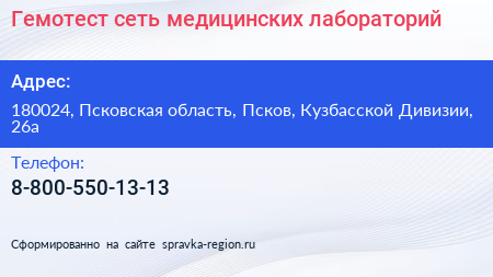Гемотест, сеть медицинских лабораторий по адресу 180024, Псковская область, Псков, Кузбасской Дивизии, 26а в дальнейшем Организация, размещена в следующих категориях: