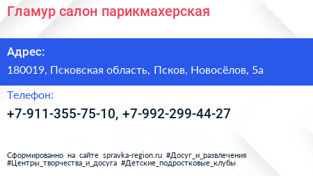 Гламур, салон-парикмахерская по адресу 180019, Псковская область, Псков, Новосёлов, 5а в дальнейшем Организация, размещена в следующих категориях: