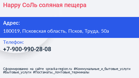 Happy СоЛь, соляная пещера по адресу 180019, Псковская область, Псков, Труда, 50а в дальнейшем Организация, размещена в следующих категориях: