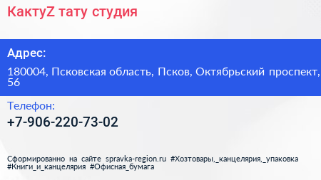 КактуZ, тату-студия по адресу 180004, Псковская область, Псков, Октябрьский проспект, 56 в дальнейшем Организация, размещена в следующих категориях: