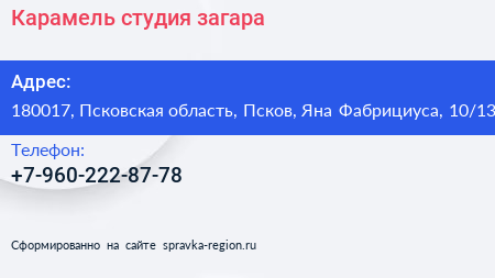 Карамель, студия загара по адресу 180017, Псковская область, Псков, Яна Фабрициуса, 10/13 в дальнейшем Организация, размещена в следующих категориях: