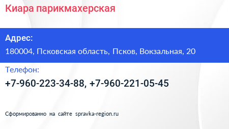 Киара, парикмахерская по адресу 180004, Псковская область, Псков, Вокзальная, 20 в дальнейшем Организация, размещена в следующих категориях: