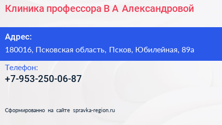 Клиника профессора В.А. Александровой по адресу 180016, Псковская область, Псков, Юбилейная, 89а в дальнейшем Организация, размещена в следующих категориях: