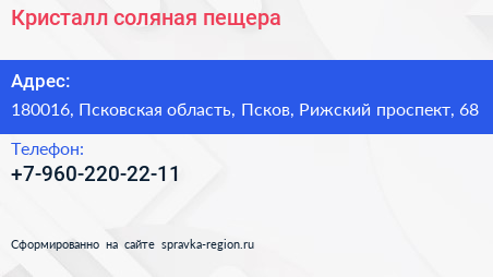 Кристалл, соляная пещера по адресу 180016, Псковская область, Псков, Рижский проспект, 68 в дальнейшем Организация, размещена в следующих категориях: