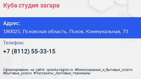 Куба, студия загара по адресу 180025, Псковская область, Псков, Коммунальная, 73 в дальнейшем Организация, размещена в следующих категориях: