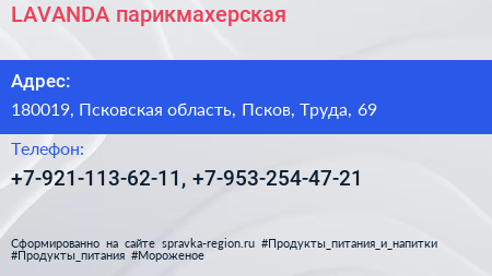 LAVANDA, парикмахерская по адресу 180019, Псковская область, Псков, Труда, 69 в дальнейшем Организация, размещена в следующих категориях: