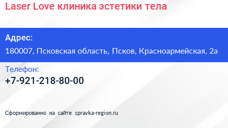 Laser Love, клиника эстетики тела по адресу 180007, Псковская область, Псков, Красноармейская, 2а в дальнейшем Организация, размещена в следующих категориях: