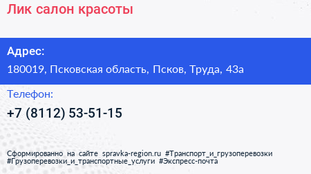 Лик, салон красоты по адресу 180019, Псковская область, Псков, Труда, 43а в дальнейшем Организация, размещена в следующих категориях: