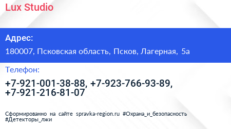 Lux Studio по адресу 180007, Псковская область, Псков, Лагерная, 5а в дальнейшем Организация, размещена в следующих категориях: