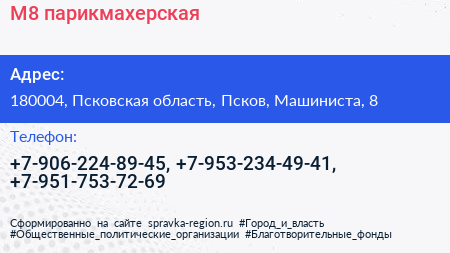 М8, парикмахерская по адресу 180004, Псковская область, Псков, Машиниста, 8 в дальнейшем Организация, размещена в следующих категориях: