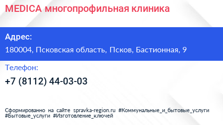 MEDICA, многопрофильная клиника по адресу 180004, Псковская область, Псков, Бастионная, 9 в дальнейшем Организация, размещена в следующих категориях: