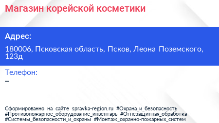 Магазин корейской косметики по адресу 180006, Псковская область, Псков, Леона Поземского, 123д в дальнейшем Организация, размещена в следующих категориях: