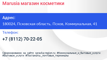 Marusia, магазин косметики по адресу 180024, Псковская область, Псков, Коммунальная, 41 в дальнейшем Организация, размещена в следующих категориях:
