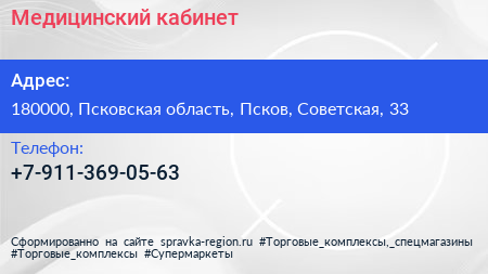 Медицинский кабинет по адресу 180000, Псковская область, Псков, Советская, 33 в дальнейшем Организация, размещена в следующих категориях: