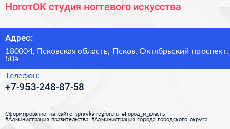 НоготОК, студия ногтевого искусства по адресу 180004, Псковская область, Псков, Октябрьский проспект, 50а в дальнейшем Организация, размещена в следующих категориях: