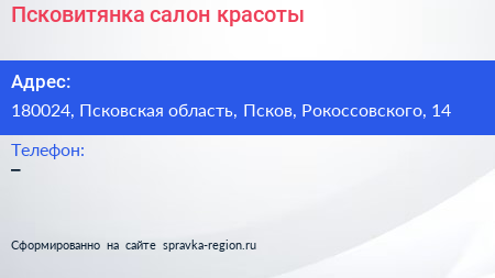 Псковитянка, салон красоты по адресу 180024, Псковская область, Псков, Рокоссовского, 14 в дальнейшем Организация, размещена в следующих категориях: