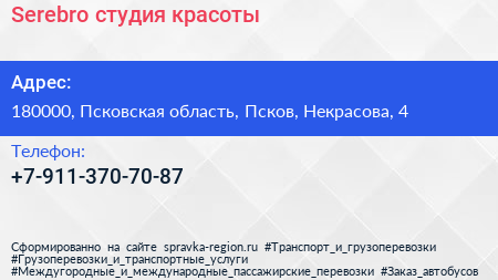 Serebro, студия красоты по адресу 180000, Псковская область, Псков, Некрасова, 4 в дальнейшем Организация, размещена в следующих категориях: