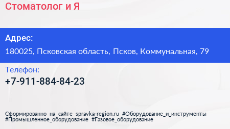 Стоматолог и Я по адресу 180025, Псковская область, Псков, Коммунальная, 79 в дальнейшем Организация, размещена в следующих категориях: