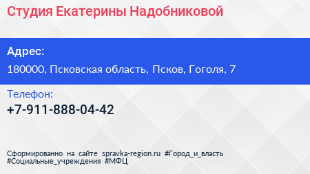 Студия Екатерины Надобниковой по адресу 180000, Псковская область, Псков, Гоголя, 7 в дальнейшем Организация, размещена в следующих категориях: