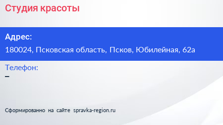Студия красоты по адресу 180024, Псковская область, Псков, Юбилейная, 62а в дальнейшем Организация, размещена в следующих категориях:
