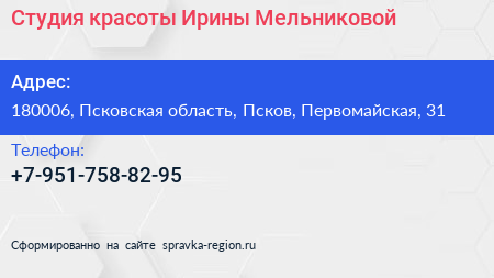 Студия красоты Ирины Мельниковой по адресу 180006, Псковская область, Псков, Первомайская, 31 в дальнейшем Организация, размещена в следующих категориях: