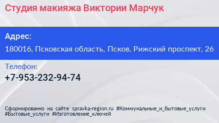 Студия макияжа Виктории Марчук по адресу 180016, Псковская область, Псков, Рижский проспект, 26 в дальнейшем Организация, размещена в следующих категориях: