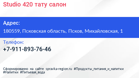 Studio 420, тату-салон по адресу 180559, Псковская область, Псков, Михайловская, 1 в дальнейшем Организация, размещена в следующих категориях: