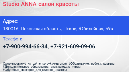 Studio ANNA, салон красоты по адресу 180016, Псковская область, Псков, Юбилейная, 69в в дальнейшем Организация, размещена в следующих категориях: