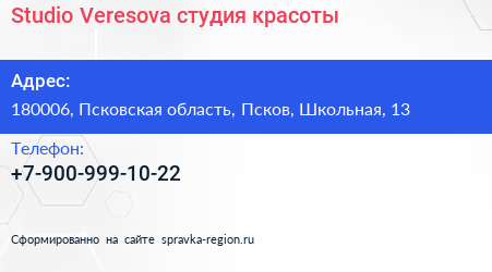 Studio Veresova, студия красоты по адресу 180006, Псковская область, Псков, Школьная, 13 в дальнейшем Организация, размещена в следующих категориях: