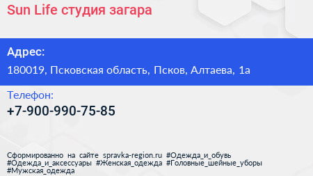 Sun Life, студия загара по адресу 180019, Псковская область, Псков, Алтаева, 1а в дальнейшем Организация, размещена в следующих категориях: