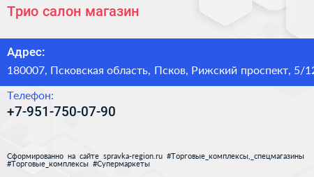 Трио, салон-магазин по адресу 180007, Псковская область, Псков, Рижский проспект, 5/12 в дальнейшем Организация, размещена в следующих категориях: