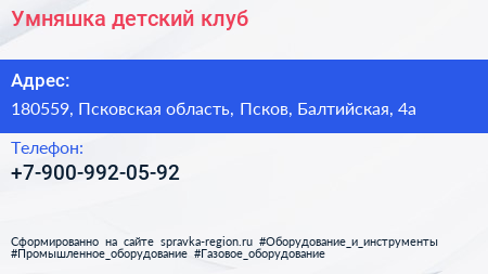 Умняшка, детский клуб по адресу 180559, Псковская область, Псков, Балтийская, 4а в дальнейшем Организация, размещена в следующих категориях: