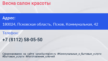 Весна, салон красоты по адресу 180024, Псковская область, Псков, Коммунальная, 42 в дальнейшем Организация, размещена в следующих категориях:
