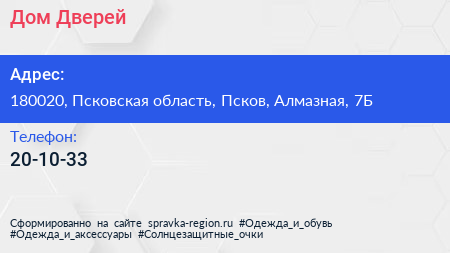 Дом Дверей по адресу 180020, Псковская область, Псков, Алмазная, 7Б в дальнейшем Организация, размещена в следующих категориях: