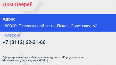 Дом Дверей по адресу 180000, Псковская область, Псков, Советская, 60 в дальнейшем Организация, размещена в следующих категориях: