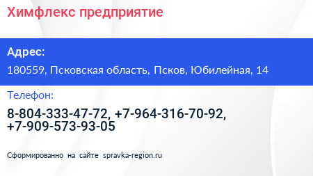 Химфлекс, предприятие по адресу 180559, Псковская область, Псков, Юбилейная, 14 в дальнейшем Организация, размещена в следующих категориях:
