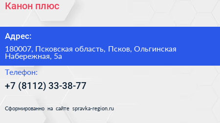 Канон плюс по адресу 180007, Псковская область, Псков, Ольгинская Набережная, 5а в дальнейшем Организация, размещена в следующих категориях: