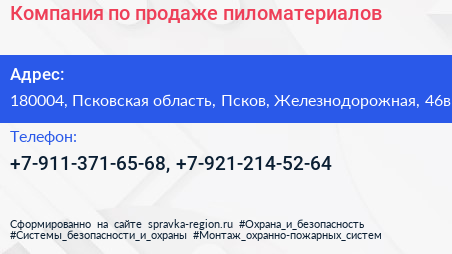 Компания по продаже пиломатериалов по адресу 180004, Псковская область, Псков, Железнодорожная, 46в в дальнейшем Организация, размещена в следующих категориях: