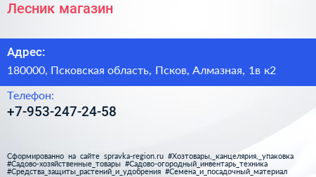 Лесник, магазин по адресу 180000, Псковская область, Псков, Алмазная, 1в к2 в дальнейшем Организация, размещена в следующих категориях: