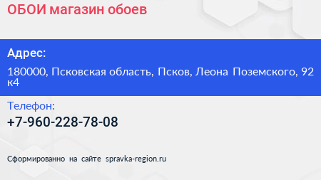 ОБОИ, магазин обоев по адресу 180000, Псковская область, Псков, Леона Поземского, 92 к4 в дальнейшем Организация, размещена в следующих категориях: