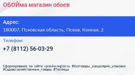 ОБОЙма, магазин обоев по адресу 180007, Псковская область, Псков, Конная, 2 в дальнейшем Организация, размещена в следующих категориях: