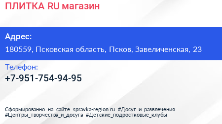 ПЛИТКА.RU, магазин по адресу 180559, Псковская область, Псков, Завеличенская, 23 в дальнейшем Организация, размещена в следующих категориях: