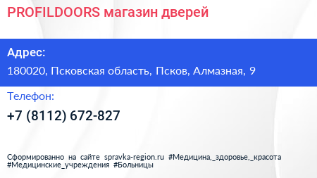 PROFILDOORS, магазин дверей по адресу 180020, Псковская область, Псков, Алмазная, 9 в дальнейшем Организация, размещена в следующих категориях: