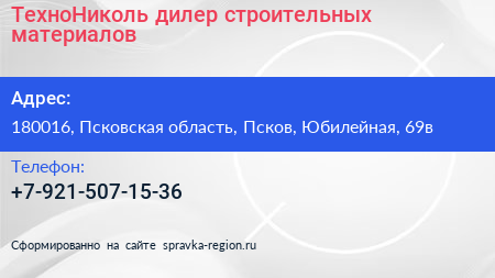 ТехноНиколь, дилер строительных материалов по адресу 180016, Псковская область, Псков, Юбилейная, 69в в дальнейшем Организация, размещена в следующих категориях: