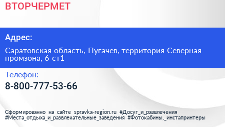 ВТОРЧЕРМЕТ по адресу Саратовская область, Пугачев, территория Северная промзона, 6 ст1 в дальнейшем Организация, размещена в следующих категориях: