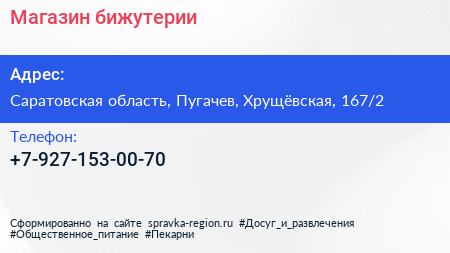 Магазин бижутерии по адресу Саратовская область, Пугачев, Хрущёвская, 167/2 в дальнейшем Организация, размещена в следующих категориях: