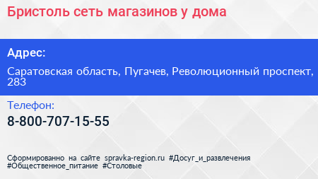 Бристоль, сеть магазинов у дома по адресу Саратовская область, Пугачев, Революционный проспект, 283 в дальнейшем Организация, размещена в следующих категориях: