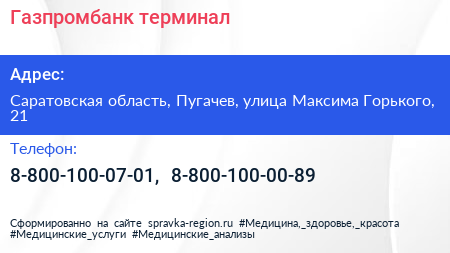 Газпромбанк, терминал по адресу Саратовская область, Пугачев, улица Максима Горького, 21 в дальнейшем Организация, размещена в следующих категориях: